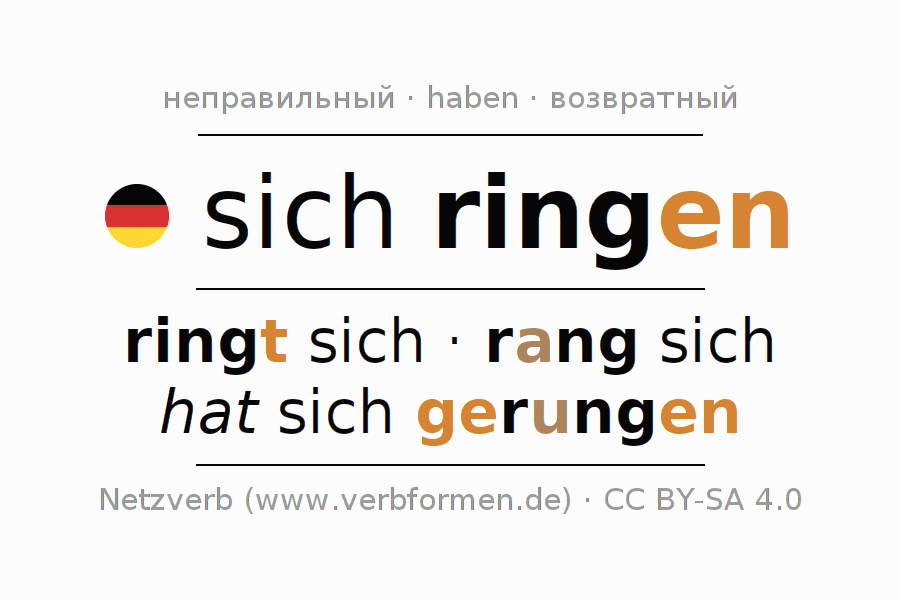 - Презенс: ich ringe mir/mich, du ringest dir/dich, er ringe sich, wir ringen uns, ihr ringet euch, sie ringen sich