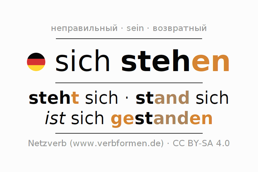 Спряжение глагола stehen (стоять, подходить) неправильное. Формы глагола steht sich, stand sich, ist sich gestanden. Чередующиеся гласные e - a - a в корне: В качестве вспомогательного глагола к sich stehen употребляется "sein". Однако имеются временные формы со вспомогательным глаголом haben. Глагол sich stehen употреблён в возвратной форме. Может употреблятьсяи невозвратная форма глагола. Склоняется в Действительный залог (актив) и употребляется в Главное предложение. Для лучшего понимания приводится большое количество примеров употребления глагола stehen. Для тренировки и закрепления навыков имеются также бесплатные рабочие листы по stehen. Можно не только sich stehen спрягать, но и все немецкие глаголы. Глагол включён в словарный запас обладателя сертификата знания немецкого языка уровня A1. 2Комментарии ☆5.0