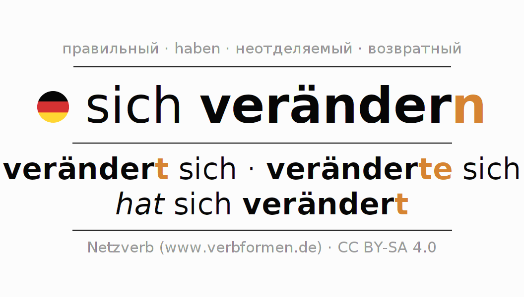 - Презенс: veränd(e)r(e) (du) dir/dich, verändern wir uns, verändert (ihr) euch, verändern Sie sich