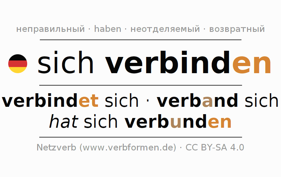 - Презенс: verbind(e) (du) dir/dich, verbinden wir uns, verbindet (ihr) euch, verbinden Sie sich