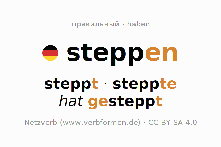 - Презенс: ich stepp(e), du steppst, er steppt, wir steppen, ihr steppt, sie steppen