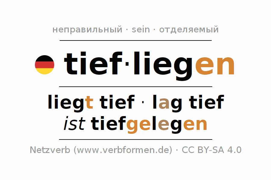 - Презенс: ich lieg(e) tief, du liegst tief, er liegt tief, wir liegen tief, ihr liegt tief, sie liegen tief
