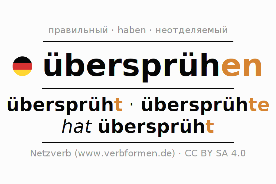 Глагол übersprühen (hat) спрягается в индикативе Действительный залог (актив) в настоящем, прошедшем и будущем времени