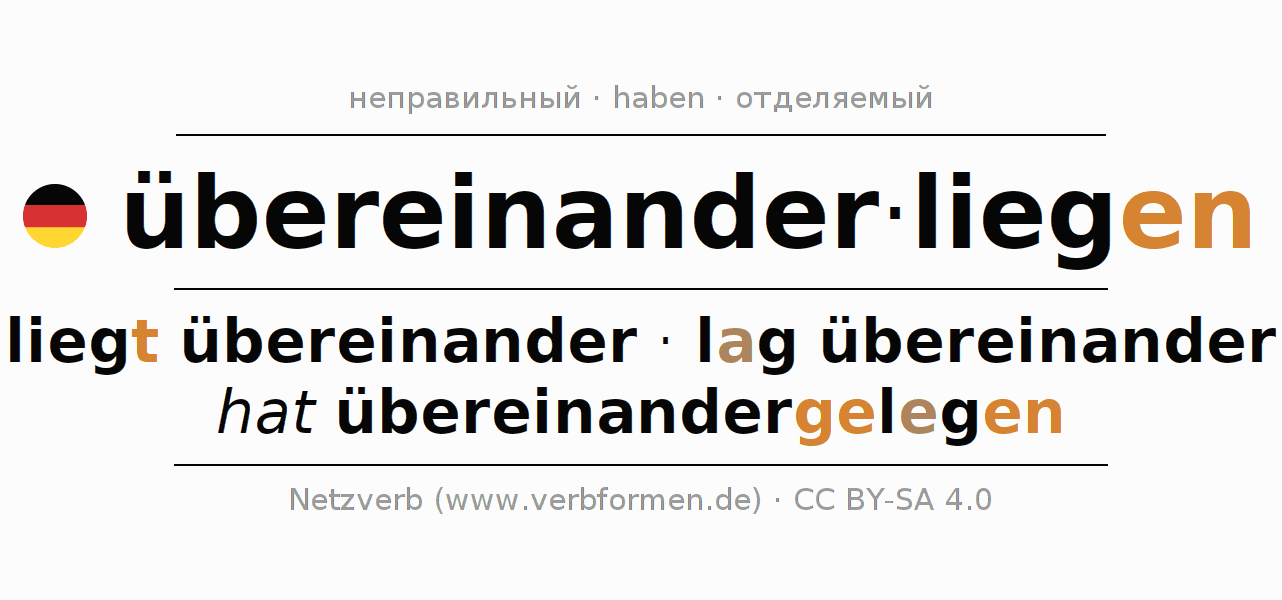 - Презенс: lieg(e) (du) übereinander, liegen wir übereinander, liegt (ihr) übereinander, liegen Sie übereinander
