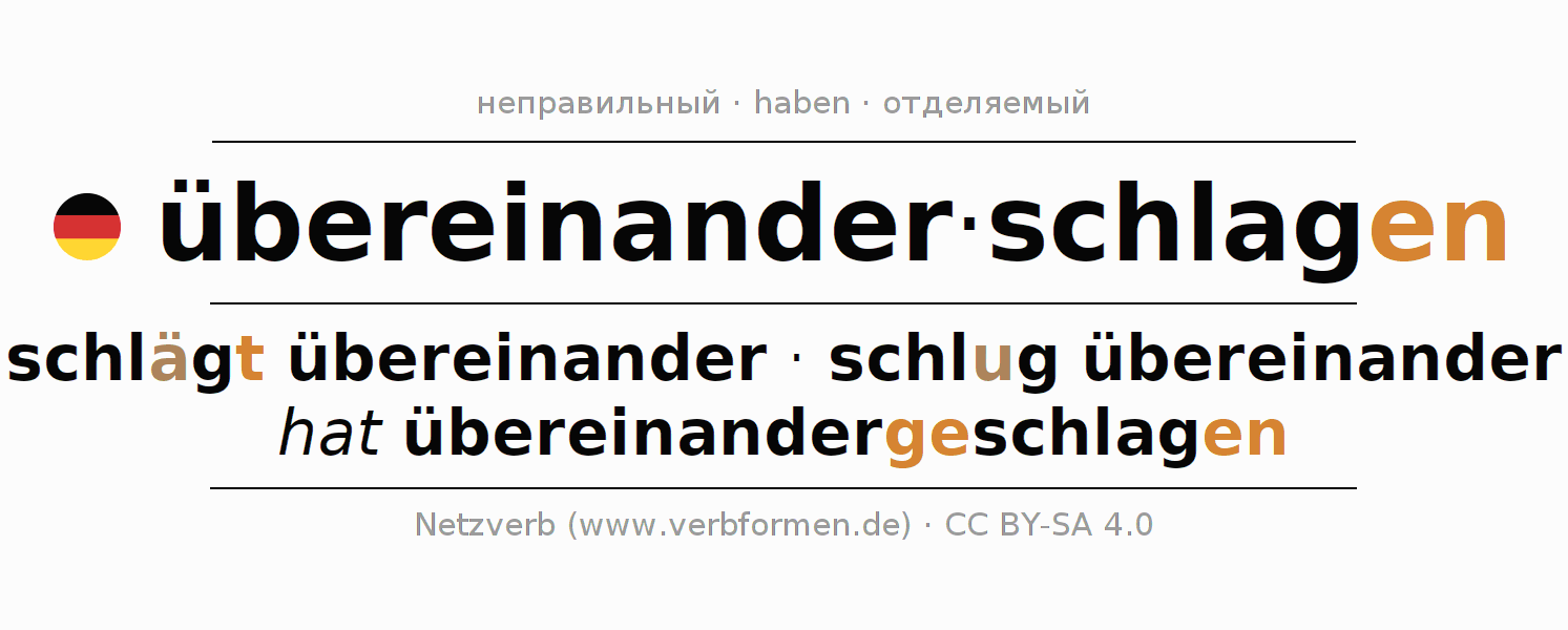 - Презенс: schlag(e) (du) übereinander, schlagen wir übereinander, schlagt (ihr) übereinander, schlagen Sie übereinander