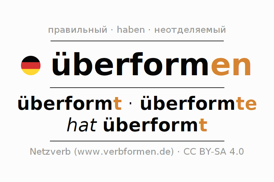 - Перфект: ich habe überformt, du hast überformt, er hat überformt, wir haben überformt, ihr habt überformt, sie haben überformt