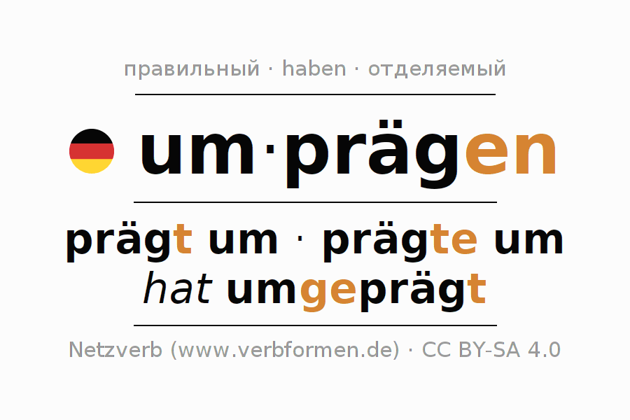 - Презенс: präg(e) (du) um, prägen wir um, prägt (ihr) um, prägen Sie um