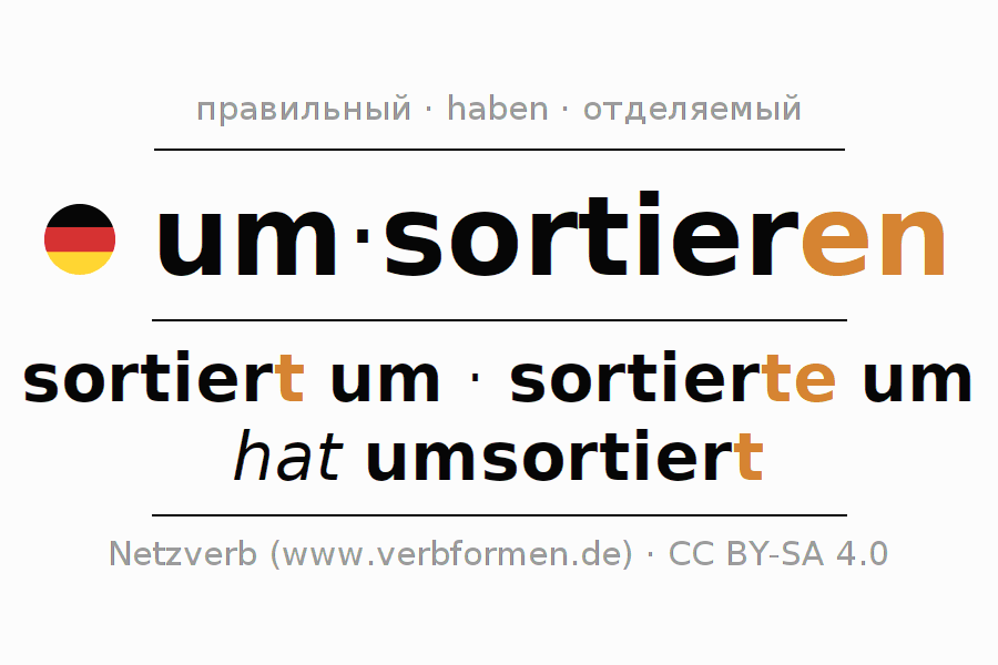 - Презенс: sortier(e) (du) um, sortieren wir um, sortiert (ihr) um, sortieren Sie um
