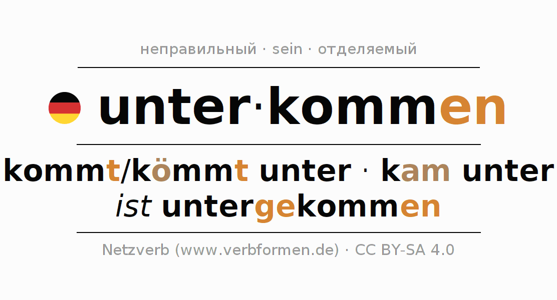 Глагол 'unter·kommen' онлайн как таблица глаголов со всеми наглядно представленными формами. Значение глагола unter·kommen таким образом является помощью для выполнения домашних заданий; подготовки к экзаменам и контрольным работам, а также к урокам немецкого языка; для обучения в вузах и при получении образования для взрослых. Именно для изучающих немецкий язык – правильное спряжение глаголов (kommt/kömmt unter - kam unter - ist untergekommen) является решающим фактором.