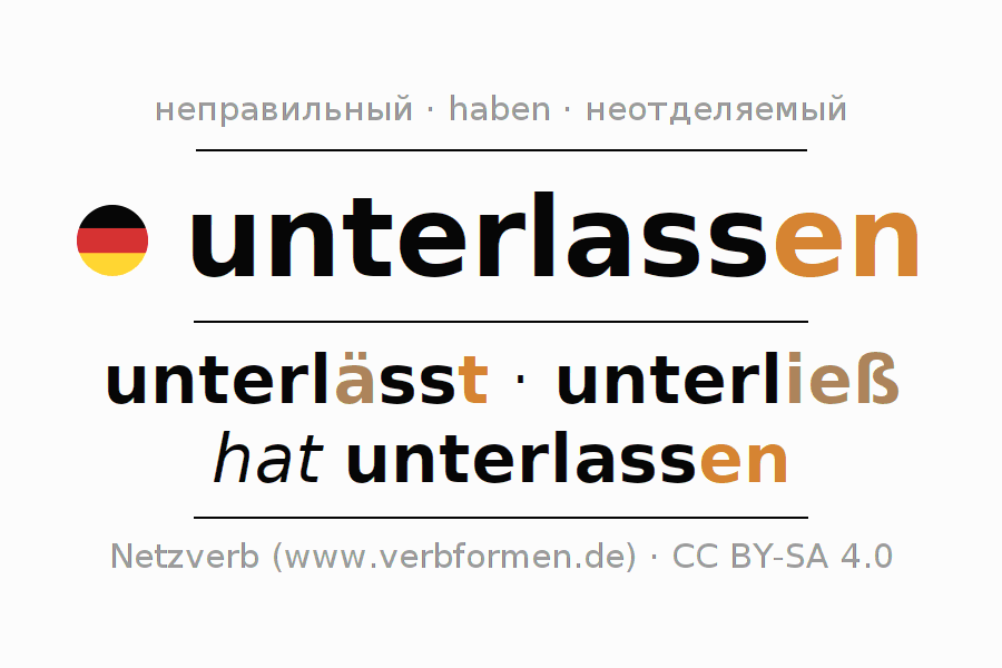 - Презенс: unterlass(e) (du), unterlassen wir, unterlasst (ihr), unterlassen Sie