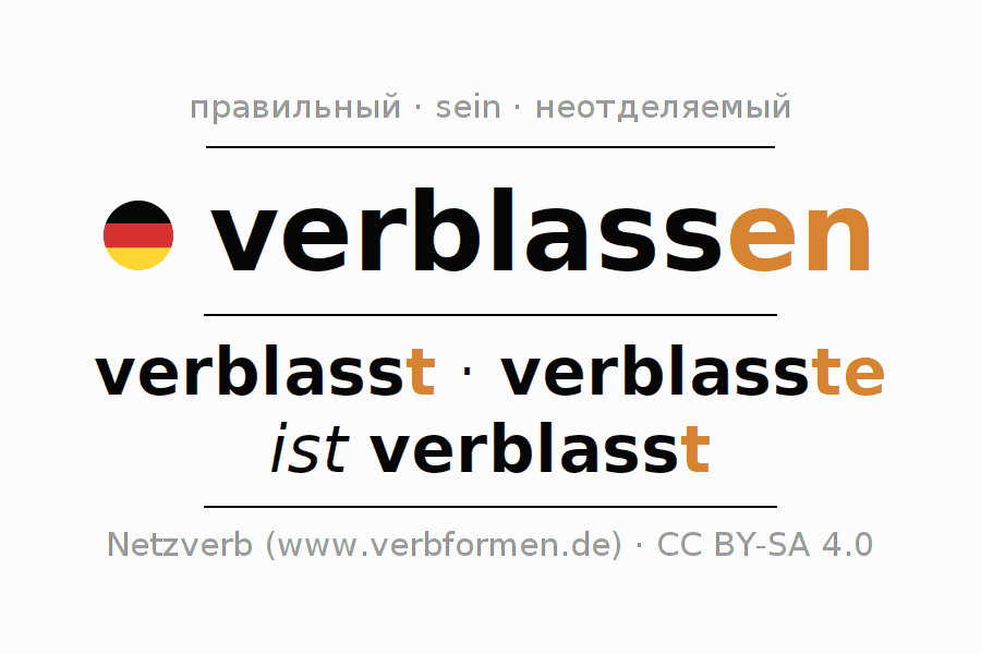 - Презенс: verblass(e) (du), verblassen wir, verblasst (ihr), verblassen Sie