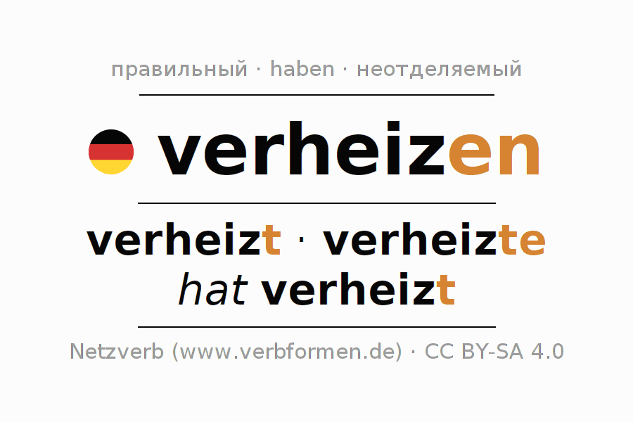 Глагол 'verheizen' онлайн как таблица глаголов со всеми наглядно представленными формами. Значение глагола verheizen таким образом является помощью для выполнения домашних заданий; подготовки к экзаменам и контрольным работам, а также к урокам немецкого языка; для обучения в вузах и при получении образования для взрослых. Именно для изучающих немецкий язык – правильное спряжение глаголов (verheizt - verheizte - hat verheizt) является решающим фактором.