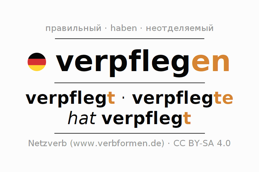 - Презенс: verpfleg(e) (du), verpflegen wir, verpflegt (ihr), verpflegen Sie