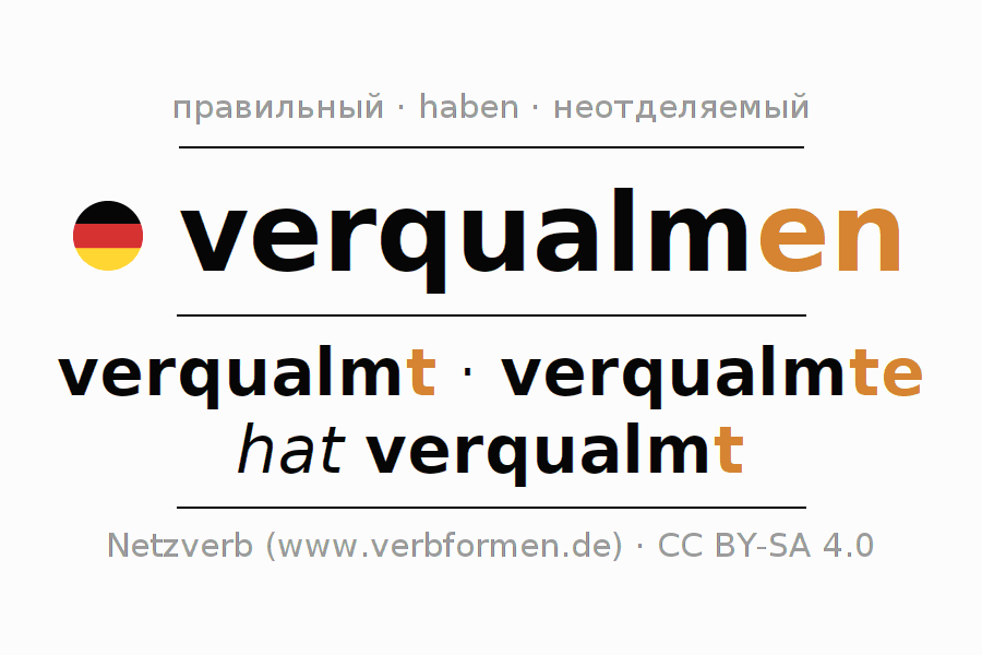 - Презенс: verqualm(e) (du), verqualmen wir, verqualmt (ihr), verqualmen Sie