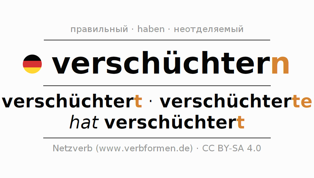 Спряжение глагола verschüchtern (запугивать, испугать) правильное. Формы глагола verschüchtert, verschüchterte, hat verschüchtert. В качестве вспомогательного глагола к verschüchtern употребляется "haben". Приставка ver- для verschüchtern неотделяемая. Склоняется в Действительный залог (актив) и употребляется в Главное предложение. Для лучшего понимания приводится большое количество примеров употребления глагола verschüchtern. Для тренировки и закрепления навыков имеются также бесплатные рабочие листы по verschüchtern. Можно не только verschüchtern спрягать, но и все немецкие глаголы. Kомментарии ☆