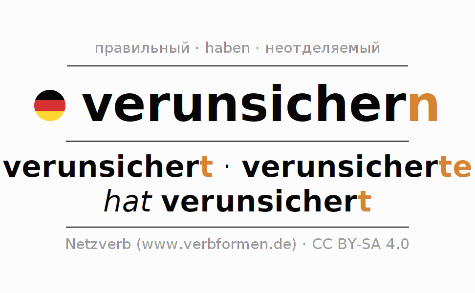 - Презенс: verunsich(e)r(e) (du), verunsichern wir, verunsichert (ihr), verunsichern Sie