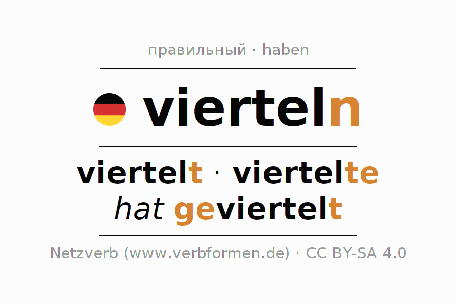 Глагол 'vierteln' онлайн как таблица глаголов со всеми наглядно представленными формами. Значение глагола vierteln таким образом является помощью для выполнения домашних заданий; подготовки к экзаменам и контрольным работам, а также к урокам немецкого языка; для обучения в вузах и при получении образования для взрослых. Именно для изучающих немецкий язык – правильное спряжение глаголов (viertelt - viertelte - hat geviertelt) является решающим фактором.