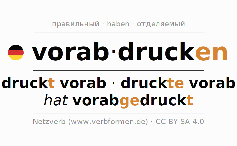 - Презенс: druck(e) (du) vorab, drucken wir vorab, druckt (ihr) vorab, drucken Sie vorab