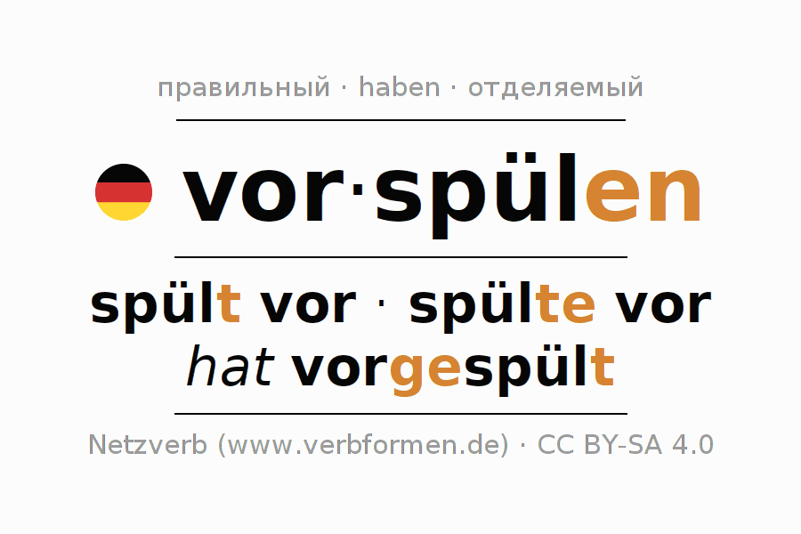 - Презенс: spül(e) (du) vor, spülen wir vor, spült (ihr) vor, spülen Sie vor