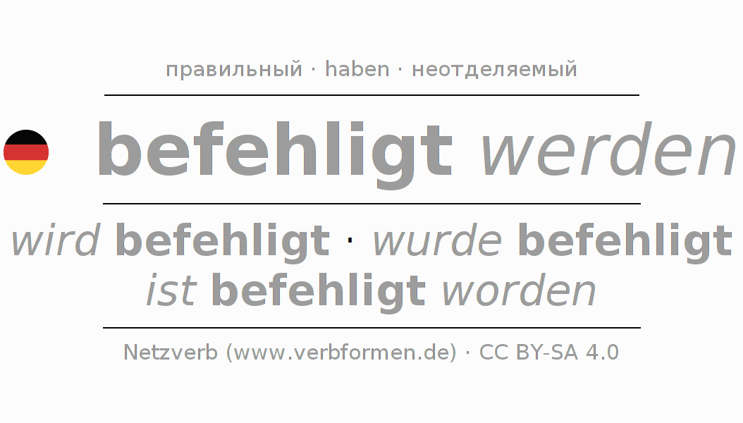 - Футурум II: ich werde befehligt worden sein, du werdest befehligt worden sein, er werde befehligt worden sein, wir werden befehligt worden sein, ihr werdet befehligt worden sein, sie werden befehligt worden sein