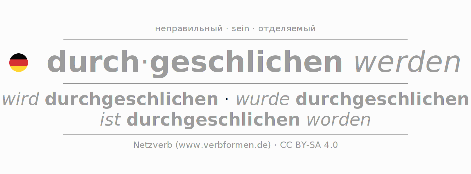 - Перфект: ich bin durchgeschlichen worden, du bist durchgeschlichen worden, er ist durchgeschlichen worden, wir sind durchgeschlichen worden, ihr seid durchgeschlichen worden, sie sind durchgeschlichen worden