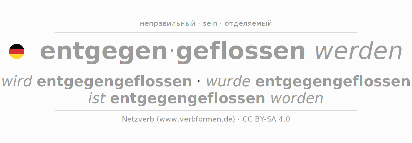 - Презенс: ich werde entgegengeflossen, du wirst entgegengeflossen, er wird entgegengeflossen, wir werden entgegengeflossen, ihr werdet entgegengeflossen, sie werden entgegengeflossen
