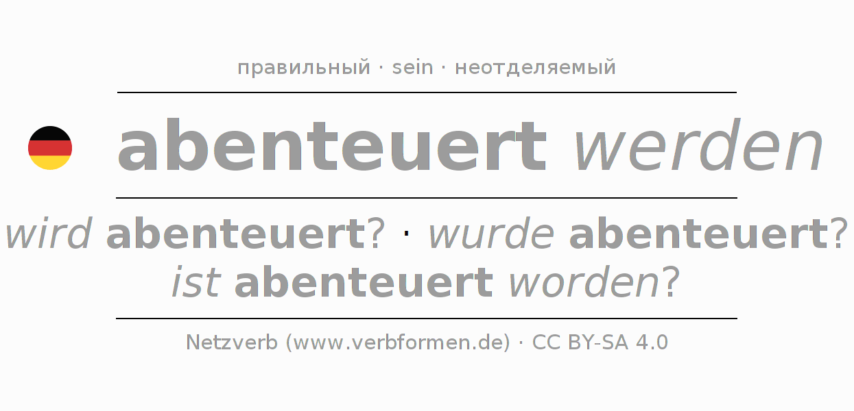 - Презенс: werde ich abenteuert?, werdest du abenteuert?, werde er abenteuert?, werden wir abenteuert?, werdet ihr abenteuert?, werden sie abenteuert?