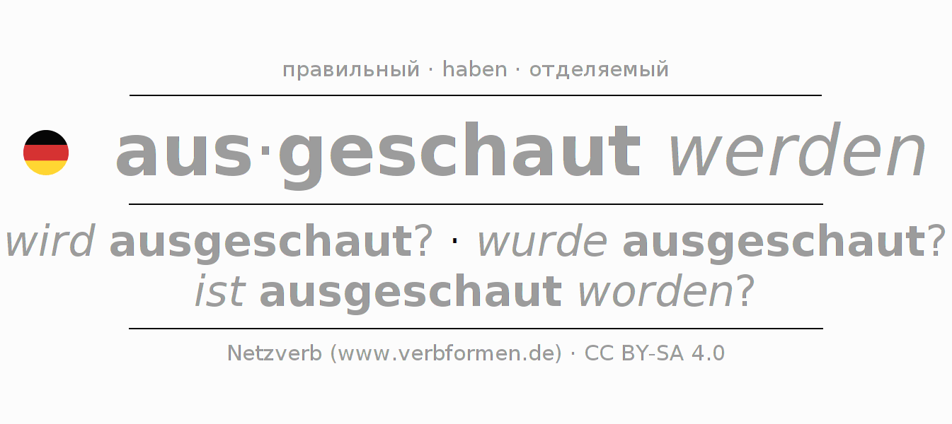 - Футурум II: werde ich ausgeschaut worden sein?, werdest du ausgeschaut worden sein?, werde er ausgeschaut worden sein?, werden wir ausgeschaut worden sein?, werdet ihr ausgeschaut worden sein?, werden sie ausgeschaut worden sein?