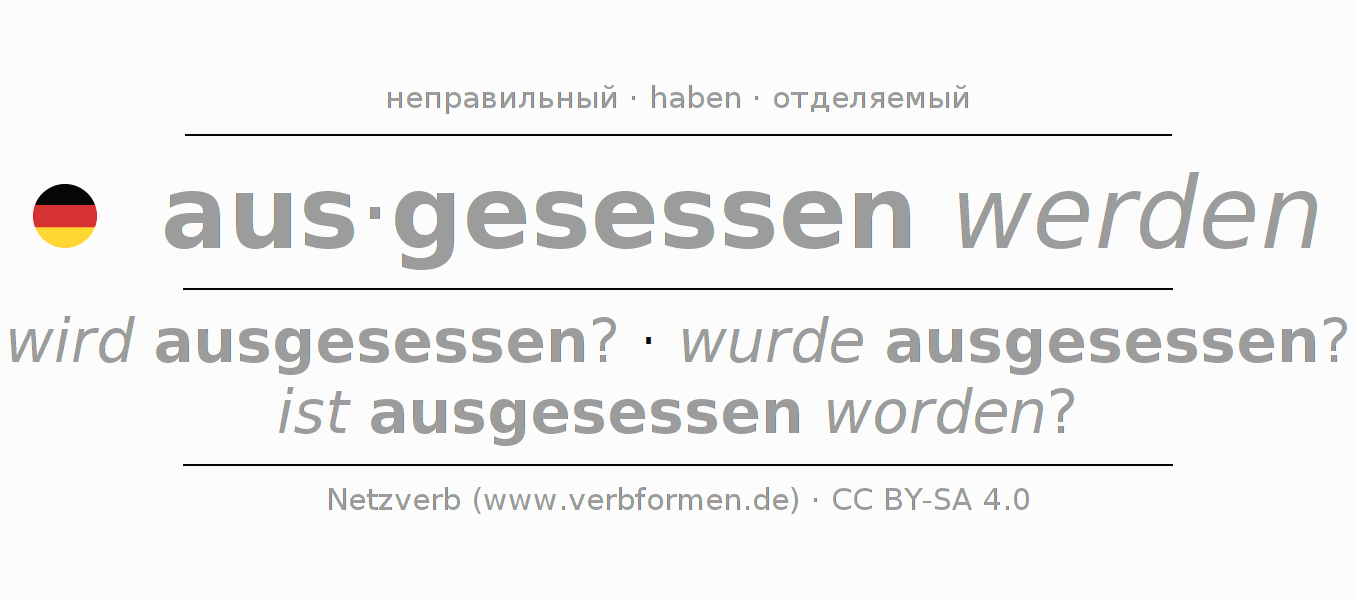 - Плюсквамперфект: war ich ausgesessen worden?, warst du ausgesessen worden?, war er ausgesessen worden?, waren wir ausgesessen worden?, wart ihr ausgesessen worden?, waren sie ausgesessen worden?