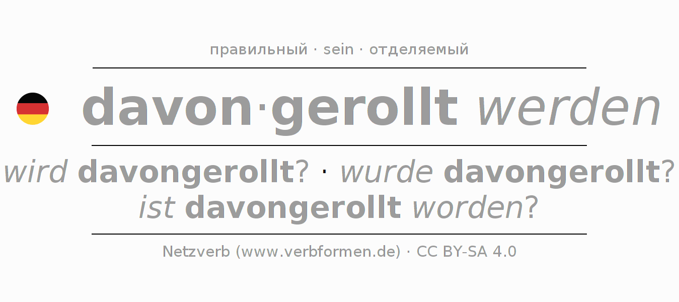 Глагол 'davon·gerollt werden' онлайн как таблица глаголов со всеми наглядно представленными формами. Значение глагола davon·gerollt werden таким образом является помощью для выполнения домашних заданий; подготовки к экзаменам и контрольным работам, а также к урокам немецкого языка; для обучения в вузах и при получении образования для взрослых. Именно для изучающих немецкий язык – правильное спряжение глаголов (wird davongerollt? - wurde davongerollt? - ist davongerollt worden?) является решающим фактором.