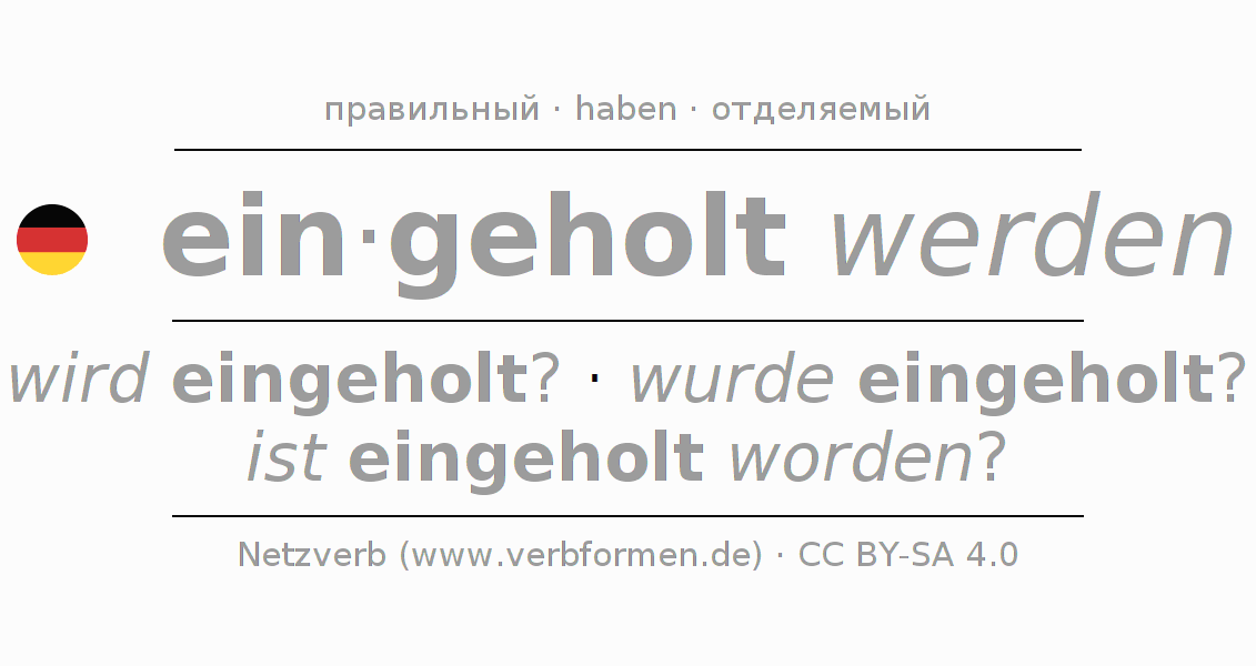 Спряжение глагола einholen (догнать, догонять) правильное. Формы глагола wird eingeholt?, wurde eingeholt?, ist eingeholt worden?. В качестве вспомогательного глагола к einholen употребляется "haben". Приставка ein- для einholen отделяемая. Склоняется в Пассив с werden и употребляется в Вопросительное предложение. Для лучшего понимания приводится большое количество примеров употребления глагола einholen. Для тренировки и закрепления навыков имеются также бесплатные рабочие листы по einholen. Можно не только einholen спрягать, но и все немецкие глаголы. Глагол включён в словарный запас обладателя сертификата знания немецкого языка уровня B2. Kомментарии ☆