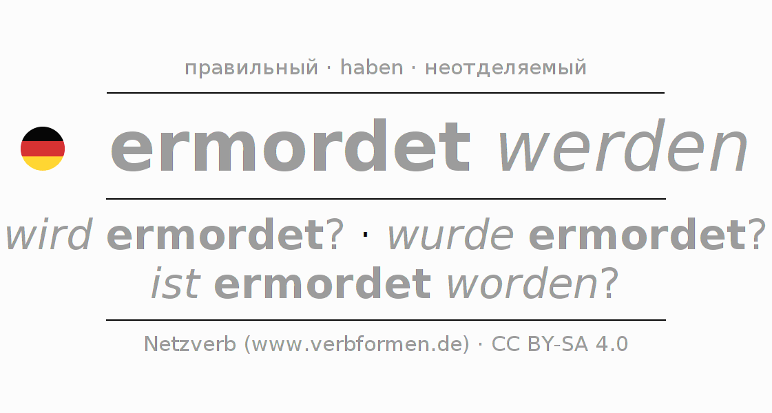 Глагол 'ermordet werden' онлайн как таблица глаголов со всеми наглядно представленными формами. Значение глагола ermordet werden таким образом является помощью для выполнения домашних заданий; подготовки к экзаменам и контрольным работам, а также к урокам немецкого языка; для обучения в вузах и при получении образования для взрослых. Именно для изучающих немецкий язык – правильное спряжение глаголов (wird ermordet? - wurde ermordet? - ist ermordet worden?) является решающим фактором.