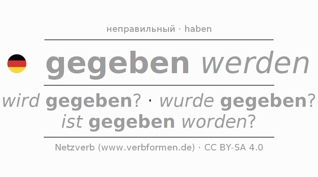 Спряжение глагола geben (давать, дать) неправильное. Формы глагола wird gegeben?, wurde gegeben?, ist gegeben worden?. Чередующиеся гласные e - a - e в корне: В качестве вспомогательного глагола к geben употребляется "haben". Глагол geben может употребляться в возвратной форме. Склоняется в Пассив с werden и употребляется в Вопросительное предложение. Для лучшего понимания приводится большое количество примеров употребления глагола geben. Для тренировки и закрепления навыков имеются также бесплатные рабочие листы по geben. Можно не только geben спрягать, но и все немецкие глаголы. Глагол включён в словарный запас обладателя сертификата знания немецкого языка уровня A1. Kомментарии ☆
