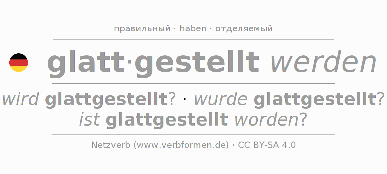 - Плюсквамперфект: war ich glattgestellt worden?, warst du glattgestellt worden?, war er glattgestellt worden?, waren wir glattgestellt worden?, wart ihr glattgestellt worden?, waren sie glattgestellt worden?