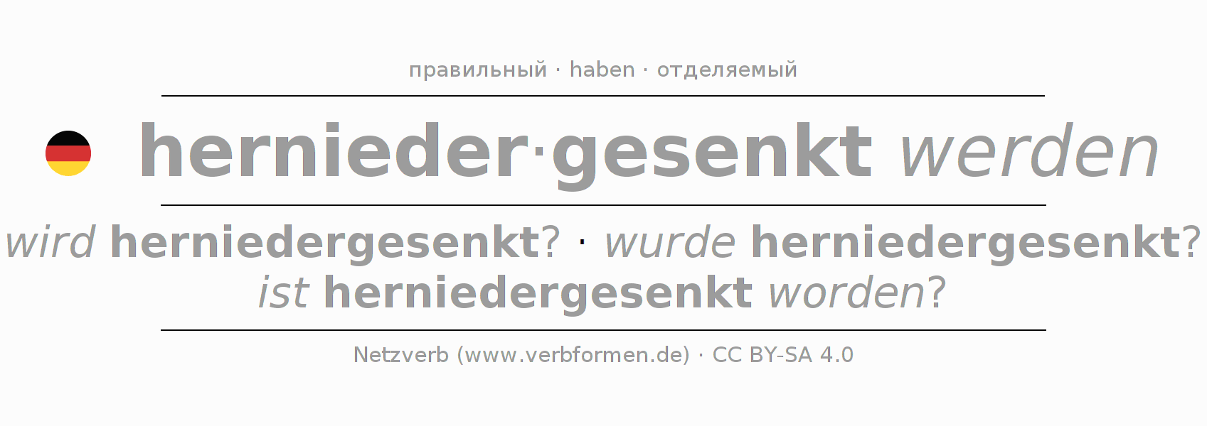 - Инфинитив I: herniedergesenkt werden, herniedergesenkt zu werden