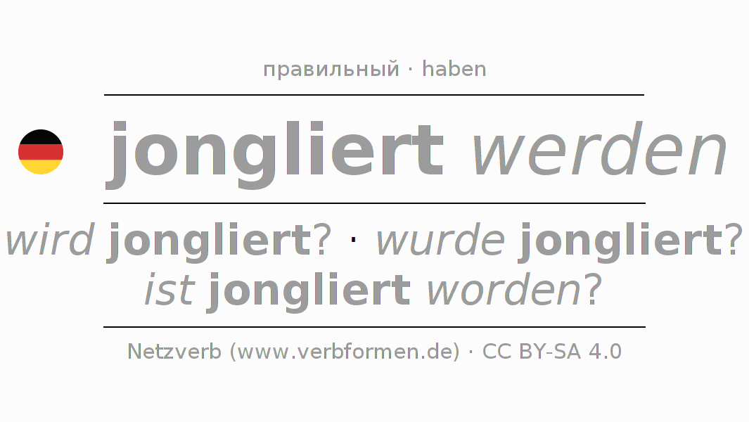 - Презенс: werde ich jongliert?, wirst du jongliert?, wird er jongliert?, werden wir jongliert?, werdet ihr jongliert?, werden sie jongliert?