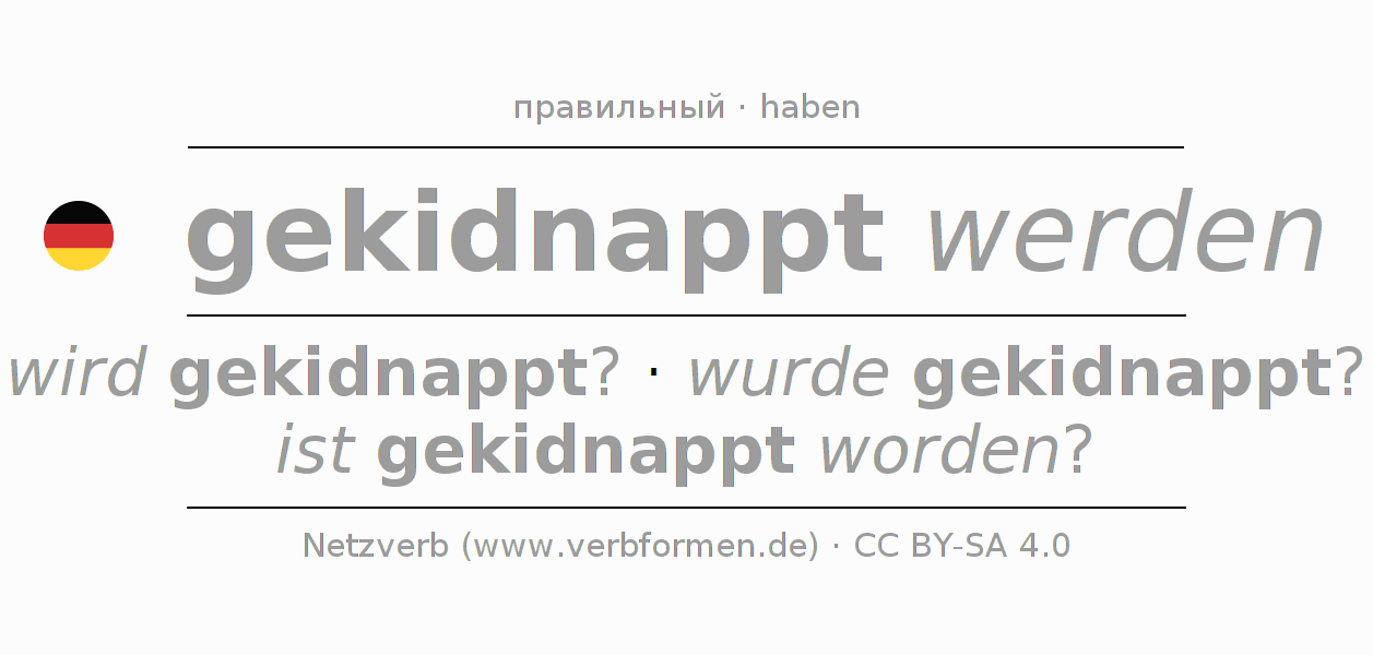 - Перфект: bin ich gekidnappt worden?, bist du gekidnappt worden?, ist er gekidnappt worden?, sind wir gekidnappt worden?, seid ihr gekidnappt worden?, sind sie gekidnappt worden?