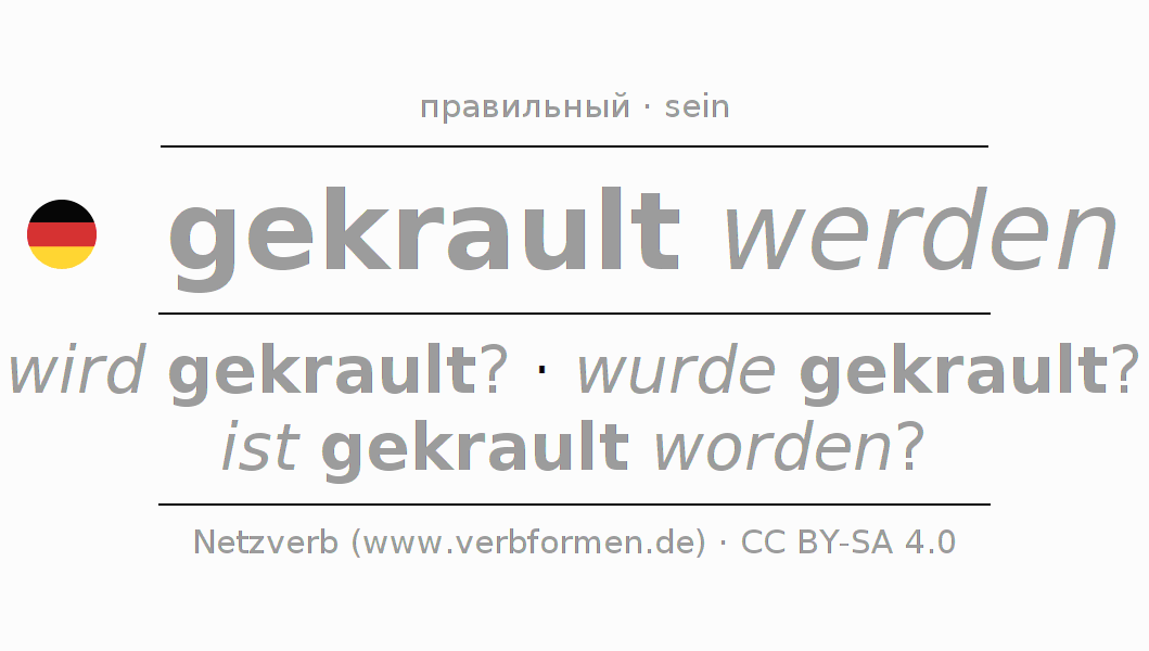 Глагол 'gekrault werden' онлайн как таблица глаголов со всеми наглядно представленными формами. Значение глагола gekrault werden таким образом является помощью для выполнения домашних заданий; подготовки к экзаменам и контрольным работам, а также к урокам немецкого языка; для обучения в вузах и при получении образования для взрослых. Именно для изучающих немецкий язык – правильное спряжение глаголов (wird gekrault? - wurde gekrault? - ist gekrault worden?) является решающим фактором.