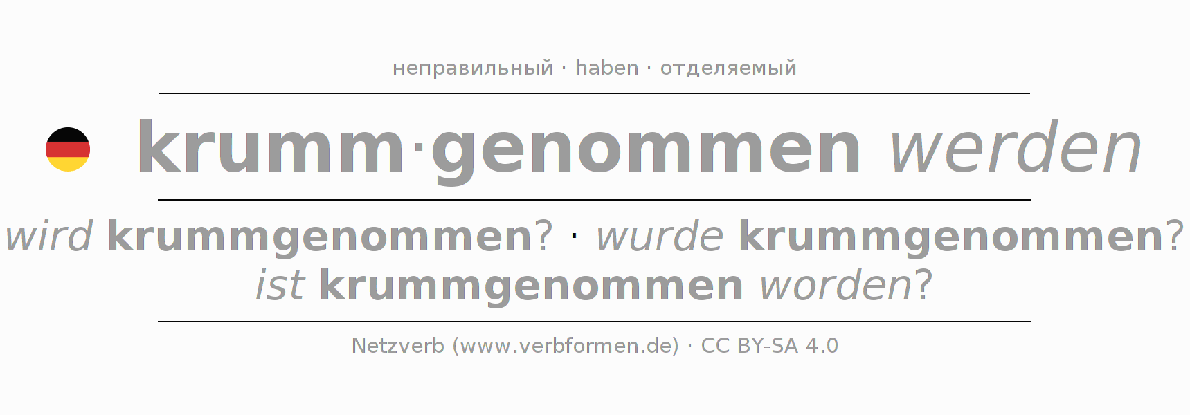 - Инфинитив I: krummgenommen werden, krummgenommen zu werden