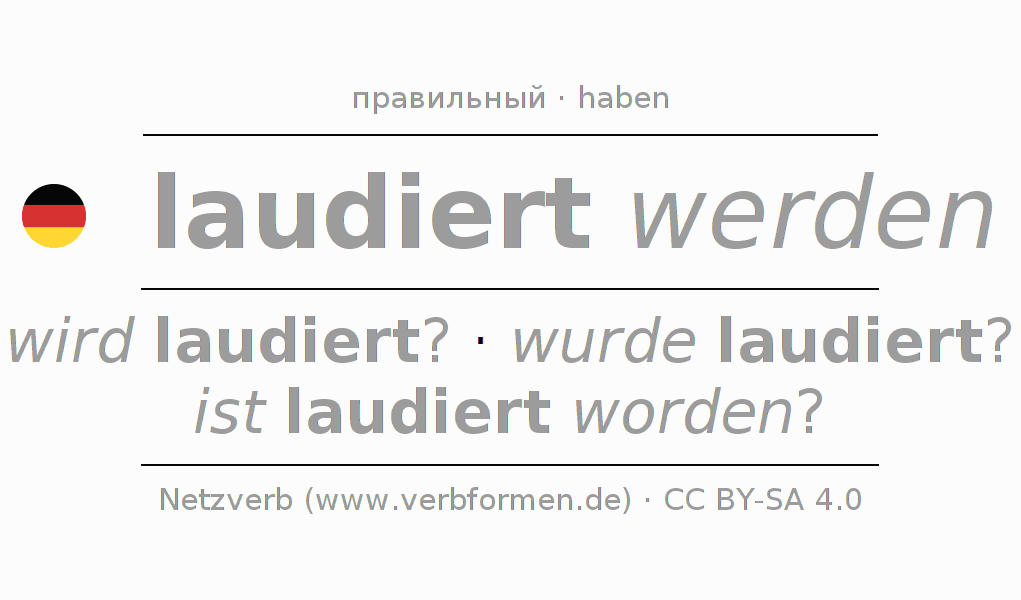 - Презенс: werde ich laudiert?, wirst du laudiert?, wird er laudiert?, werden wir laudiert?, werdet ihr laudiert?, werden sie laudiert?