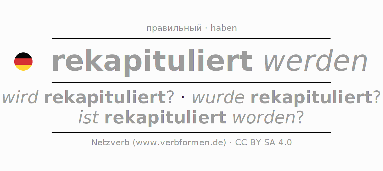 - Плюсквамперфект: war ich rekapituliert worden?, warst du rekapituliert worden?, war er rekapituliert worden?, waren wir rekapituliert worden?, wart ihr rekapituliert worden?, waren sie rekapituliert worden?