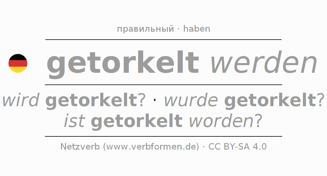 Глагол 'getorkelt werden' онлайн как таблица глаголов со всеми наглядно представленными формами. Значение глагола getorkelt werden таким образом является помощью для выполнения домашних заданий; подготовки к экзаменам и контрольным работам, а также к урокам немецкого языка; для обучения в вузах и при получении образования для взрослых. Именно для изучающих немецкий язык – правильное спряжение глаголов (wird getorkelt? - wurde getorkelt? - ist getorkelt worden?) является решающим фактором.