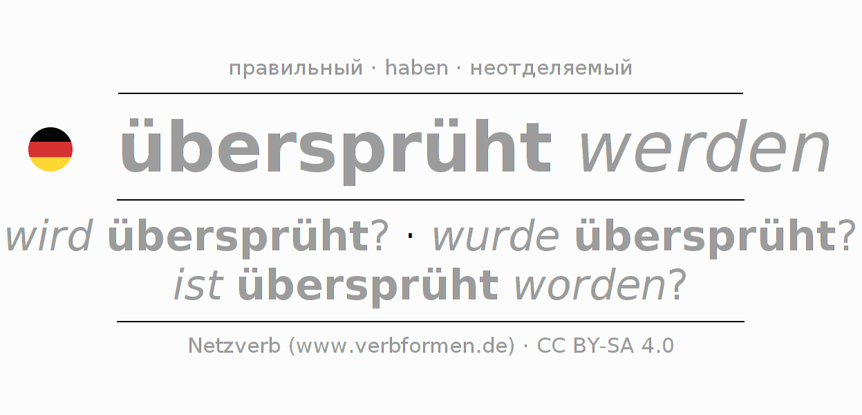 Спряжение глагола übersprühen (покрывать, распылять) правильное. Формы глагола wird übersprüht?, wurde übersprüht?, ist übersprüht worden?. В качестве вспомогательного глагола к übersprühen употребляется "haben". Однако имеются временные формы со вспомогательным глаголом sein. Приставка über- для übersprühen неотделяемая. Может быть и отделяемой. Склоняется в Пассив с werden и употребляется в Вопросительное предложение. Для лучшего понимания приводится большое количество примеров употребления глагола übersprühen. Для тренировки и закрепления навыков имеются также бесплатные рабочие листы по übersprühen. Можно не только übersprühen спрягать, но и все немецкие глаголы. Kомментарии ☆