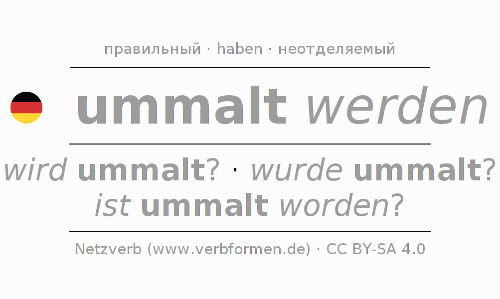 - Презенс: werde ich ummalt?, wirst du ummalt?, wird er ummalt?, werden wir ummalt?, werdet ihr ummalt?, werden sie ummalt?