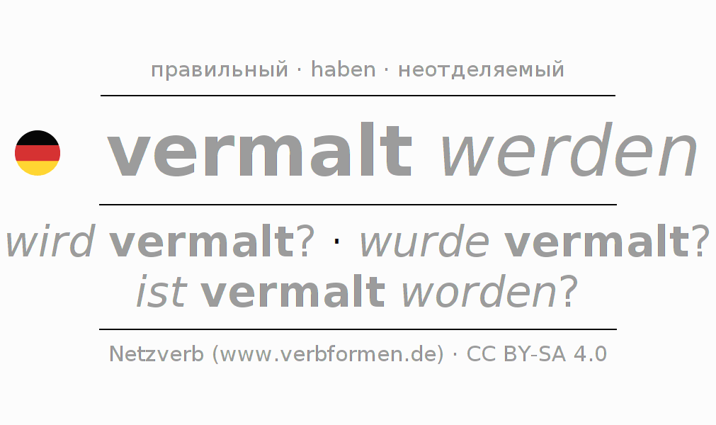 Спряжение глагола vermalen (забрасывать краской, закрашивать) правильное. Формы глагола wird vermalt?, wurde vermalt?, ist vermalt worden?. В качестве вспомогательного глагола к vermalen употребляется "haben". Приставка ver- для vermalen неотделяемая. Склоняется в Пассив с werden и употребляется в Вопросительное предложение. Для лучшего понимания приводится большое количество примеров употребления глагола vermalen. Для тренировки и закрепления навыков имеются также бесплатные рабочие листы по vermalen. Можно не только vermalen спрягать, но и все немецкие глаголы. Kомментарии ☆