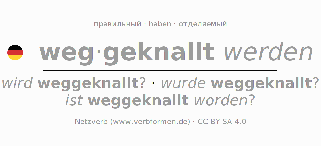 Глагол 'weg·geknallt werden' онлайн как таблица глаголов со всеми наглядно представленными формами. Значение глагола weg·geknallt werden таким образом является помощью для выполнения домашних заданий; подготовки к экзаменам и контрольным работам, а также к урокам немецкого языка; для обучения в вузах и при получении образования для взрослых. Именно для изучающих немецкий язык – правильное спряжение глаголов (wird weggeknallt? - wurde weggeknallt? - ist weggeknallt worden?) является решающим фактором.