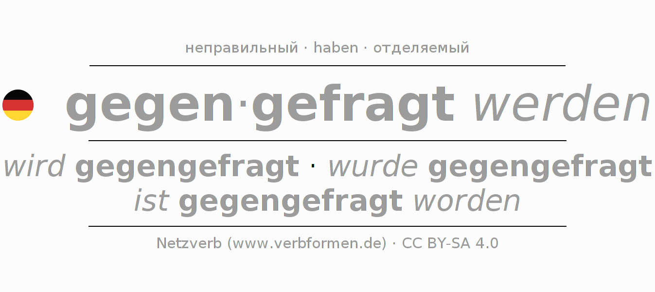 - Презенс: ich werde gegengefragt, du wirst gegengefragt, er wird gegengefragt, wir werden gegengefragt, ihr werdet gegengefragt, sie werden gegengefragt
