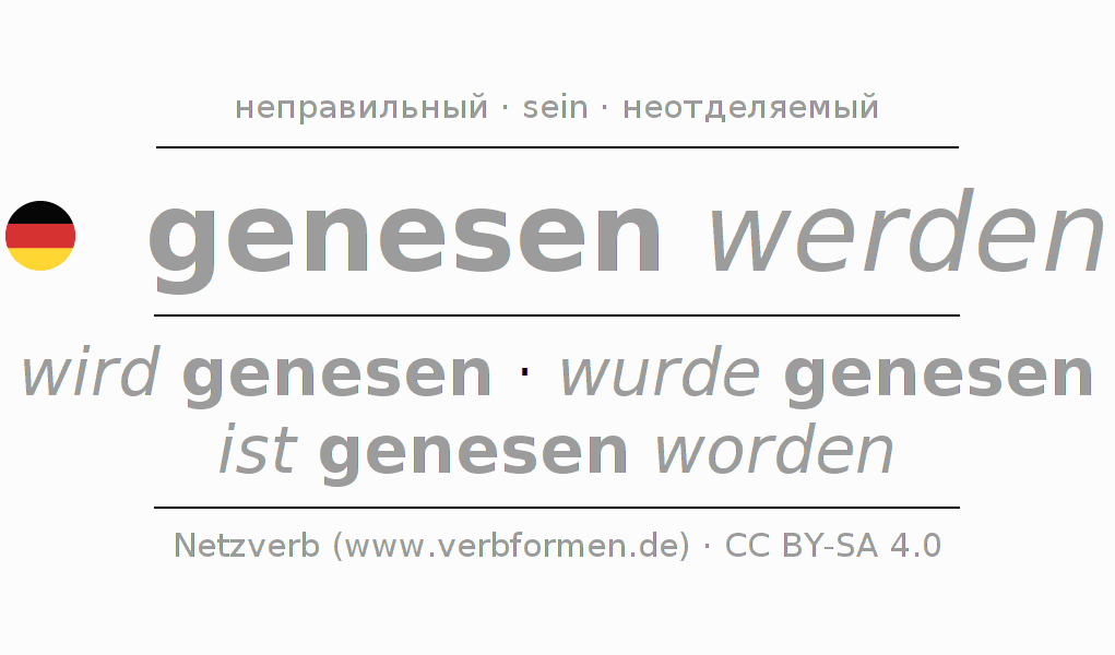 Спряжение глагола genesen (выздороветь, выздоравливать) неправильное. Формы глагола wird genesen, wurde genesen, ist genesen worden. Чередующиеся гласные e - a - e в корне: В качестве вспомогательного глагола к genesen употребляется "sein". Приставка ge- для genesen неотделяемая. Склоняется в Пассив с werden и употребляется в Главное предложение. Для лучшего понимания приводится большое количество примеров употребления глагола genesen. Для тренировки и закрепления навыков имеются также бесплатные рабочие листы по genesen. Можно не только genesen спрягать, но и все немецкие глаголы. Глагол включён в словарный запас обладателя сертификата знания немецкого языка уровня C2. Kомментарии ☆
