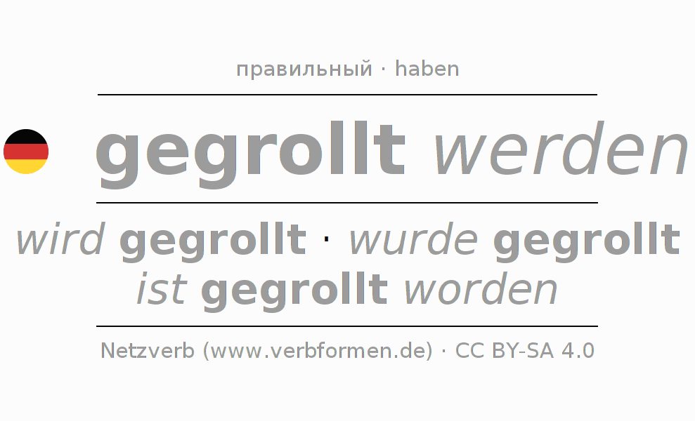 Глагол 'gegrollt werden' онлайн как таблица глаголов со всеми наглядно представленными формами. Значение глагола gegrollt werden таким образом является помощью для выполнения домашних заданий; подготовки к экзаменам и контрольным работам, а также к урокам немецкого языка; для обучения в вузах и при получении образования для взрослых. Именно для изучающих немецкий язык – правильное спряжение глаголов (wird gegrollt - wurde gegrollt - ist gegrollt worden) является решающим фактором.