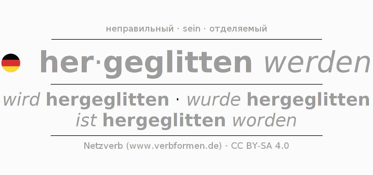 - Перфект: ich bin hergeglitten worden, du bist hergeglitten worden, er ist hergeglitten worden, wir sind hergeglitten worden, ihr seid hergeglitten worden, sie sind hergeglitten worden